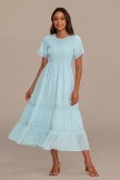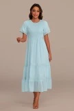 Blue Short Sleeve Round Neck Smocked Tiered Midi Dress