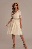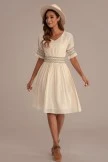Cream colored midi dress with embroidery detail and smocking around the waist and sleeves, v-neck which really makes the dress pop. Easy pullover style.