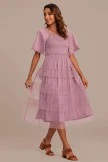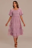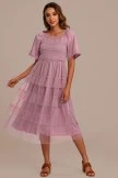 The Mauve Dot Smocked Tiered Ruffle Midi Dress is a perfect wedding guest look! The modest and flattering square neckline, a smocked top, a tiered ruffle skirt, short ruffle sleeves. Make a lasting impression at your next event with this beautiful midi dress!