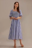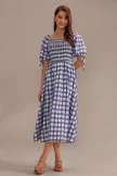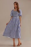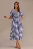 Navy Plaid Short Puff Sleeve Square Neck Smocked Midi Dress